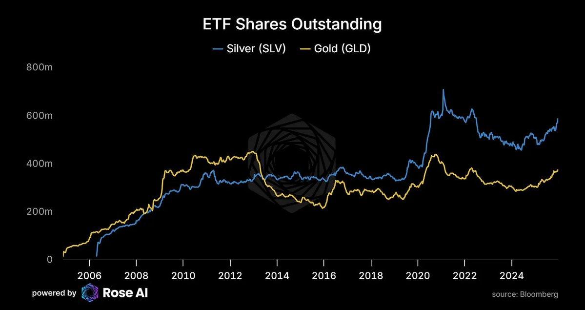 - After years of capital outflows, the number of outstanding shares of the SLV ETF is rising again. As prices rise, demand is also increasing.