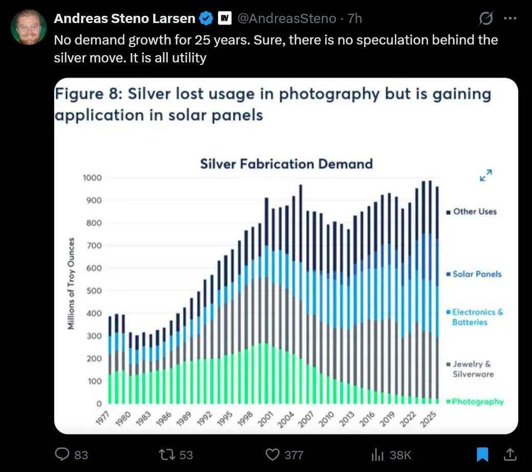 For the past 25 years, demand for silver has barely increased, and supply has not risen significantly. But everything changed with the rise of the solar energy industry. Demand for silver from the photography industry gradually disappeared, and the solar energy industry not only filled that gap but also further fueled an explosive growth in silver demand.