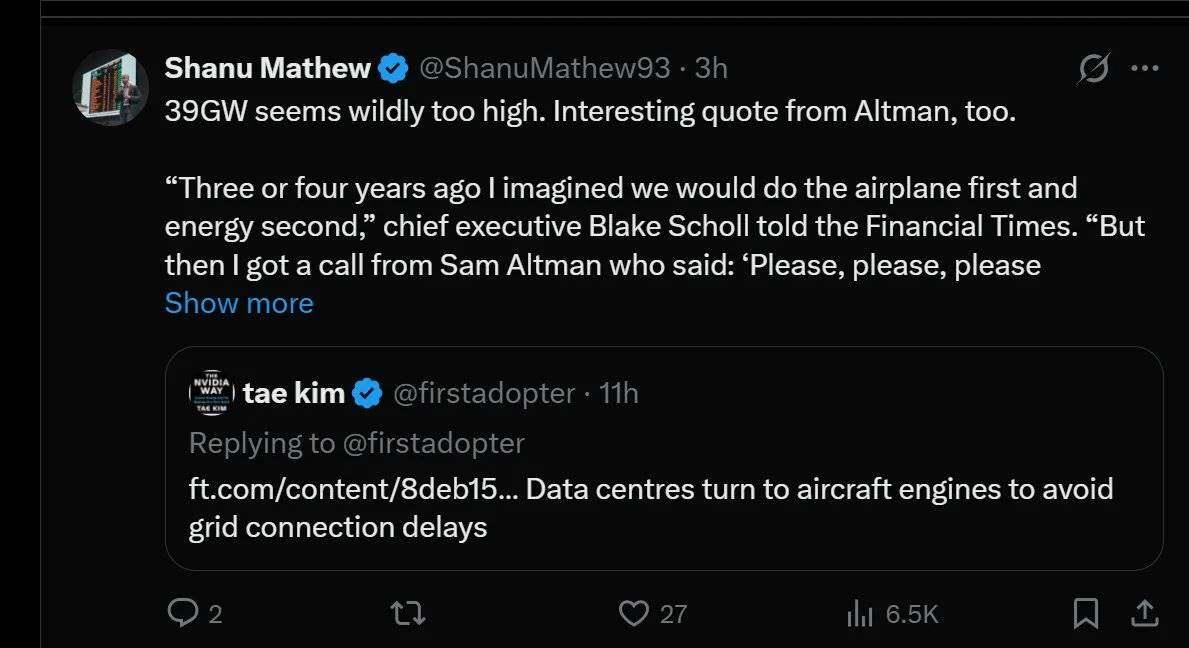 - Sam Altman (CEO of OpenAI) is urgently contacting businesses to secure a power supply.