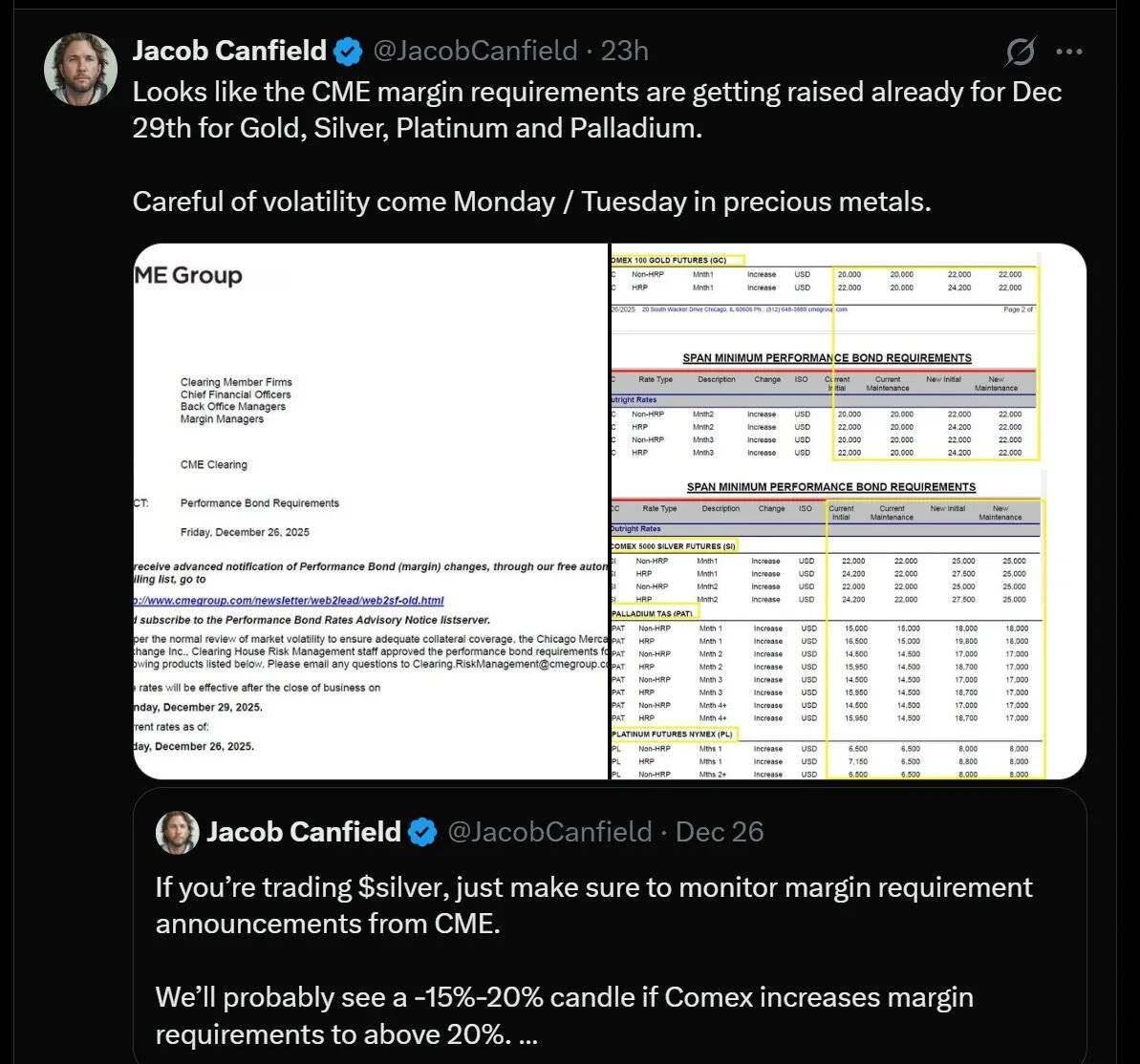 The CME (Chicago Mercantile Exchange) announced that it will raise margin requirements for precious metals starting December 29.