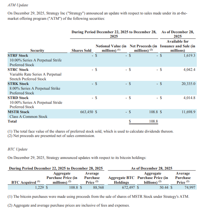 According to an official announcement, MicroStrategy purchased 1,229 Bitcoins between December 22nd and 28th, 2025, for approximately $108.8 million, at an average price of approximately $88,568 per Bitcoin. This purchase was funded by proceeds raised through its At-The-Market (ATM) plan to sell common stock. As of December 28th, MicroStrategy held a total of 672,497 Bitcoins, with an average cost of approximately $74,997 per Bitcoin, representing a total investment of $50.44 billion.