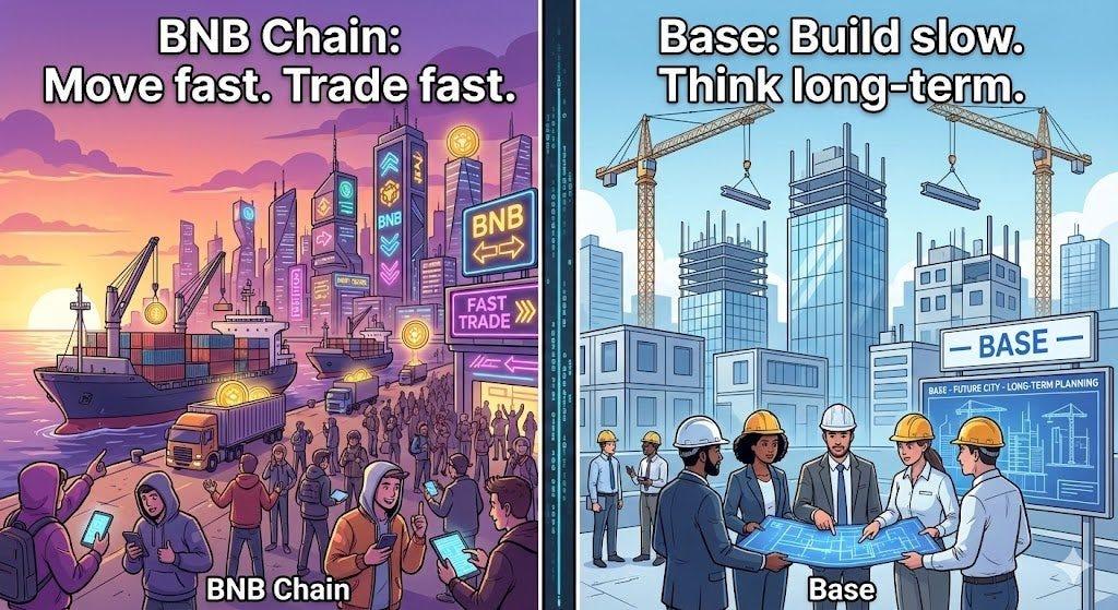Seen this way, BNB Chain and Base are not fighting over the same users. They are growing in the environments they understand best.
