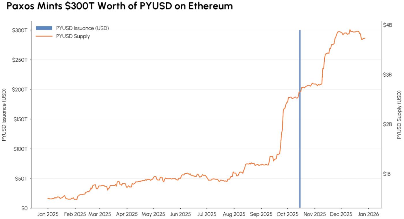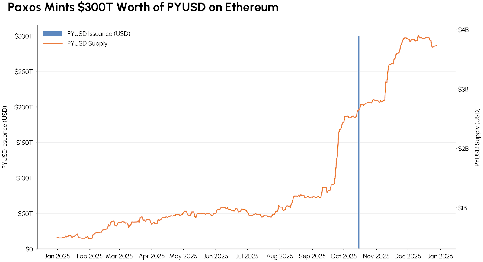 In October, Paxos mistakenly minted $300T worth of PYUSD during an internal transfer, briefly pushing onchain supply beyond the scale of the U.S. dollar money supply and even global GDP. The unbacked tokens existed for approximately 20 minutes before being detected and burned, returning PYUSD supply to roughly $2.6B at the time.
