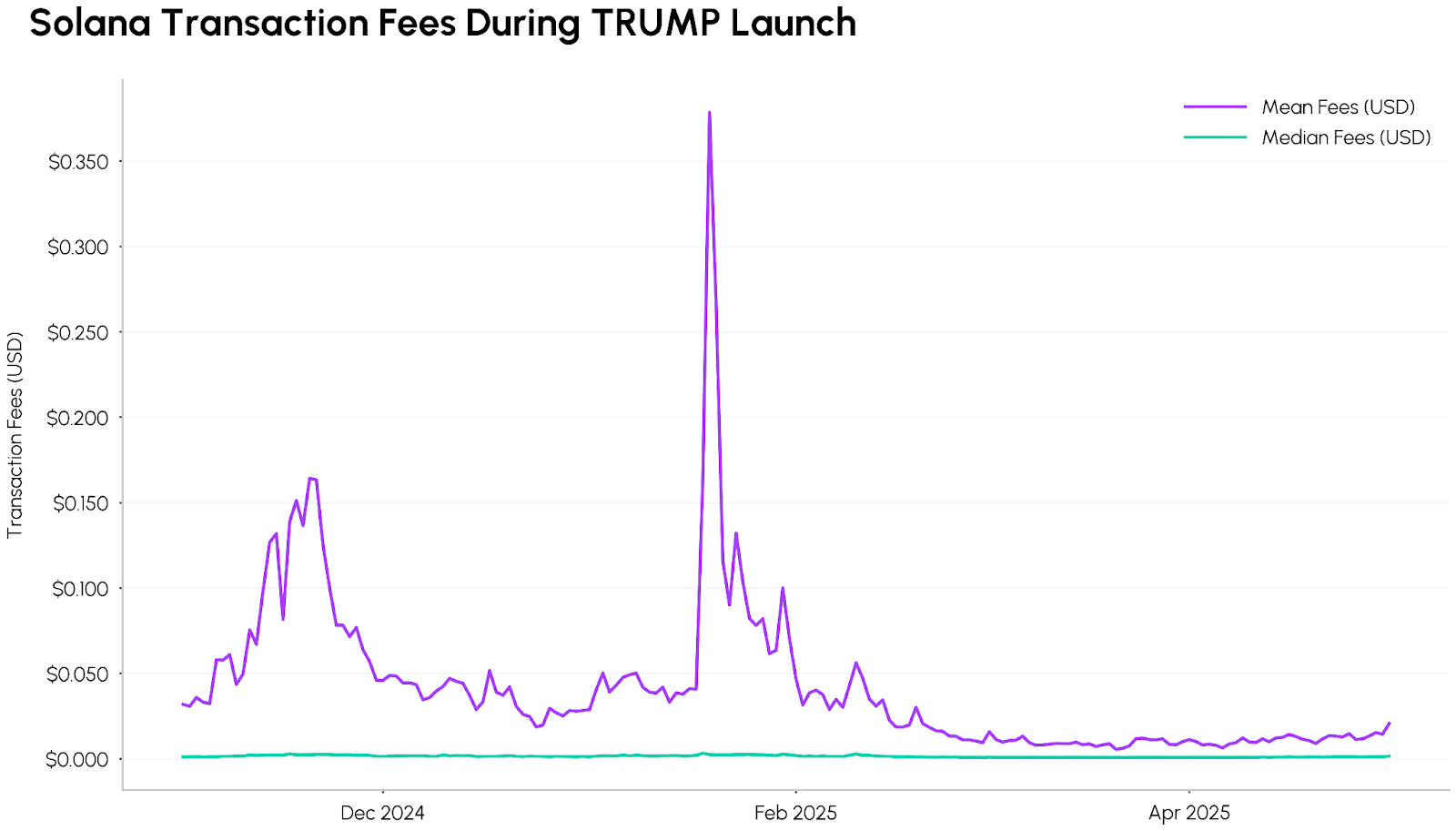 Under this extreme load and influx of liquidity, Solana’s infrastructure held up well, while keeping fees low and relatively predictable for users. While mean transaction fees spiked by 825% to $0.37 in response to network congestion, median fees remained stable at around $0.003. This event proved to be a valuable real world stress test for Solana, highlighting how major blockchains may be faced with sudden spikes in user demand, whether from memecoins or the wave of tokenized assets coming onchain.