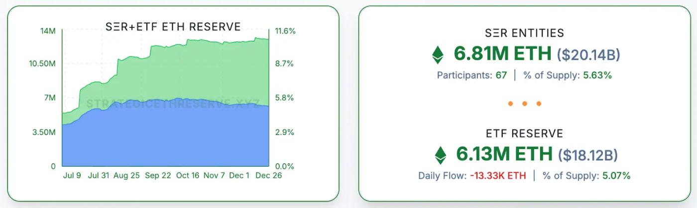 Data prior to the deadline showed that DAT and ETF together held a total of 10.7% of the circulating supply of ETH. The former held a total of 6.81 million ETH (approximately US$20.14 billion), while the latter held 6.13 million ETH (approximately US$18.12 billion). This also indicates that the market supply structure of Ethereum has undergone a qualitative change, and institutional holdings are anchoring the lower limit of Ethereum's value.