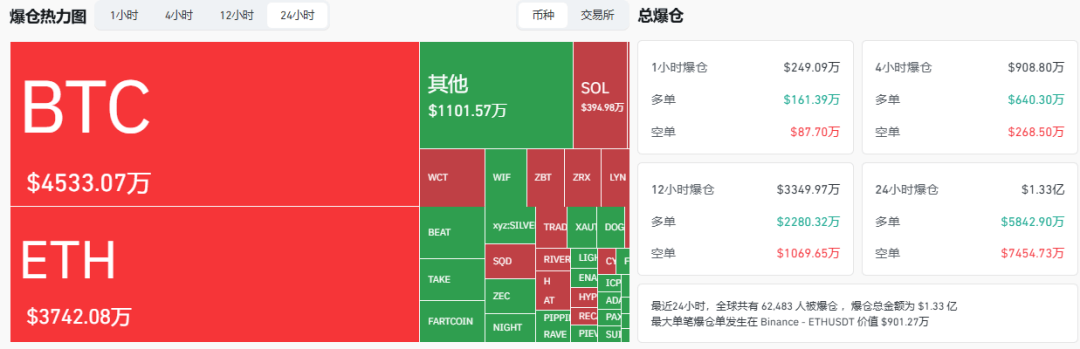 In the past 24 hours, a total of 62,483 people across the internet have been liquidated, with a total of $133 million. Among them, long positions suffered a bloodbath ($58.429 million), and short positions were not spared either ($74.5473 million).