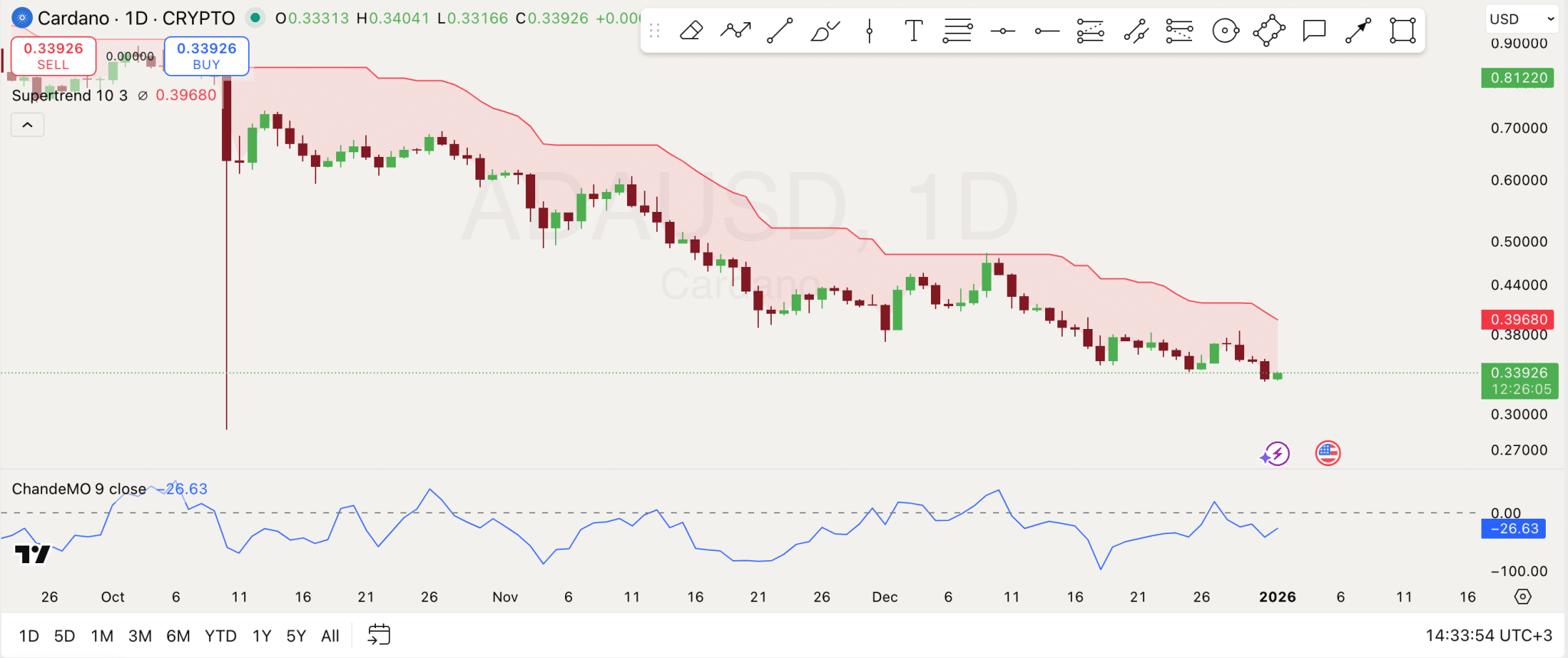 TradingView’s 1-day Cardano chart shows a slight upward movement from the recent low. The Supertrend indicator is in a bearish phase, indicated by the red band above the price, suggesting that the trend is still negative. The Chande Momentum Oscillator (CMO) is at -26.63, signaling weak but improving momentum.
