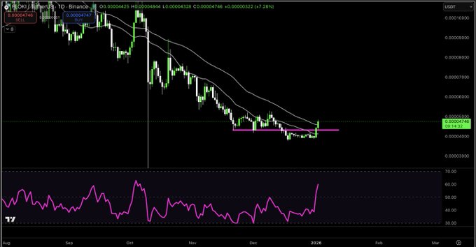 Significant strength in large cap memes last few days $floki looking to reclaim its 50DMA for first time since October Daily RSI also reclaiming 50 for first time since October
