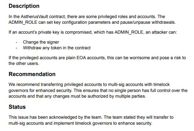 So let us start with the Vault contract that holds a lot of the funds inside Aster. This is an upgradeable proxy contract configured in such a way that the team can take all the money. And not only is this true but it is even acknowledged, in writing, in an audit of the platform. That narrative here is roughly that in the initial design a single address could steal all the money in the vault. Then an auditor noticed that and the team committed to move to a multisig. This is in writing in an audit provided by the Aster team itself on their own website. That is pretty conclusive proof: