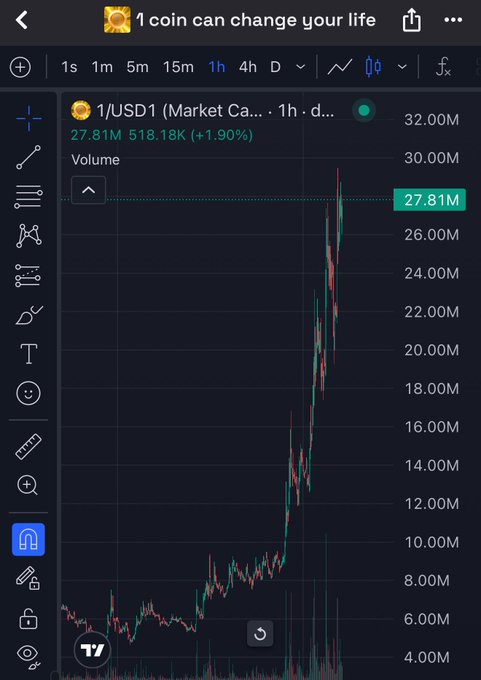 If you are not following me, I honestly do not know who you are following. I posted #1COIN more than 10 times when it was in the 6 to 7M range. And I still do not see any reason this cannot push into the hundreds of millions if USD1 Season really goes crazy. Mic drop. ☝️