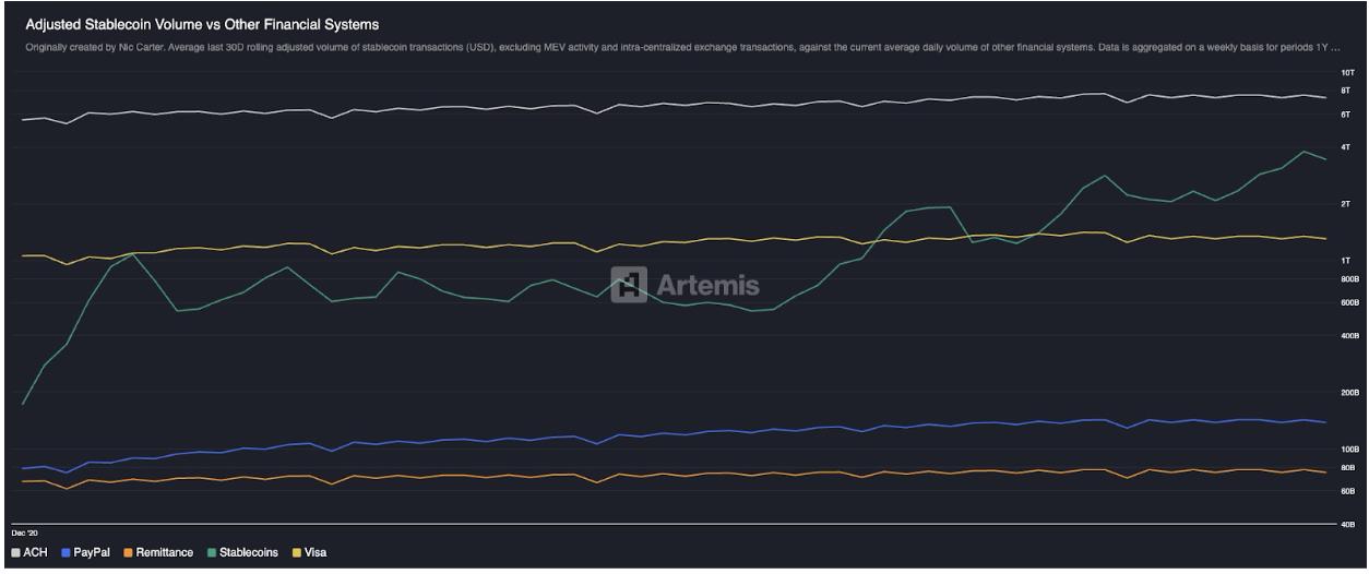 This shift is already evident in large-scale applications. The market capitalization of stablecoins has grown from near zero to approximately $300 billion in less than a decade, and even excluding inter-exchange transfers and maximum withdrawable value (MEV), the actual volume of economic transactions they handle has surpassed that of traditional payment networks such as PayPal and Visa. For the first time, a situation has emerged where non-bank, non-card payment networks can truly achieve global-scale operations.