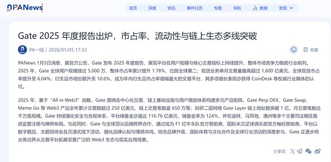 Gate released its 2025 annual report this week, and it's a bit different from what I expected. Gate has always been known for its fast listing of Altcoin and the wide variety of coins available. I personally prefer trading some promising coins from Coinbase, such as $DBR $Aleph $Hopr, as these types of coins have good trading depth on Gate. However, Gate's spot market share of 6.04% in 2025 was not as expected, possibly because the counterfeit market performed poorly last year. On the contrary, Gate's derivatives market share rose to 10.6%. It's speculated that Gate's derivatives growth is driven by options. Gate heavily promoted options products last year, and I was invited to participate in the Gate options product Space at that time. Altcoin are showing signs of activity, but I'm hesitant to mention those three words (referring to cryptocurrency altcoins), as those mainly depend on macro liquidity. Tonight's US ADP nonfarm payroll data will influence the Fed's easing path. If altcoins rally, smaller cryptocurrencies might have an opportunity. If you haven't registered with Gate yet, you can register first: gatenode.xyz/share/tvbeeeee