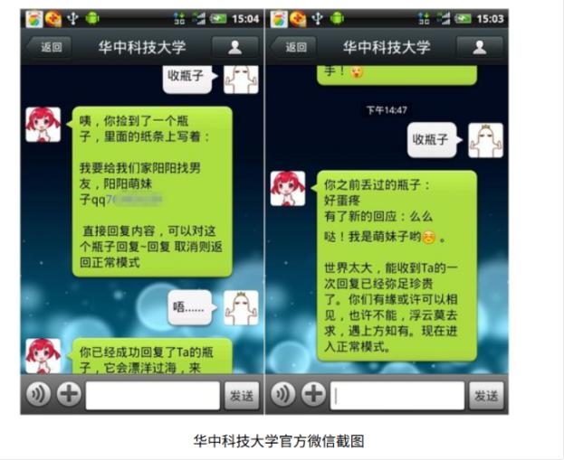 In 2013, WeChat was just starting out. Xiao Hong and his team created a "WeChat Drift Bottle" feature—a campus drift bottle version from Huazhong University of Science and Technology. Users could reply with "drift bottle" to "drop a bottle" with their message, which would be randomly received by others; they could also "receive bottles," randomly receiving bottles from others and replying to them.