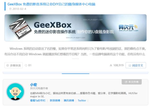 In the "Otherworld Software World" community, we can still see a large amount of his content. Among them, the earliest article, written in 2010, titled "GeeXBox: A Free Multimedia System That Lets You DIY Your Own Portable Media Center PC," has over 100,000 views.