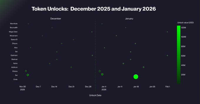 This chart highlights major token unlocks exclusively for investors in December 2025 and January 2026. Notably, ONDO will unlock a total of $141.38 million on January 18, 2026. These figures specifically exclude other token allocation categories such as team member distributions, airdrops, or other non-investor allocations.