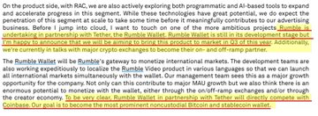 Rumble wallet in partnership w/ Tether going live in Q3. Called out Coinbase specifically in their earnings call and planning to compete H2H