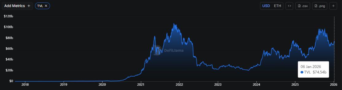 Recent on-chain data confirms a renewed concentration of decentralized finance activity on Ethereum, reinforcing its role as the primary settlement layer for on-chain financial markets. According to DeFiLlama, Ethereum’s DeFi total value locked (TVL) stands at over USD 70 billion, accounting for approximately 65–70% of total DeFi TVL across public blockchains, depending on the measurement window.