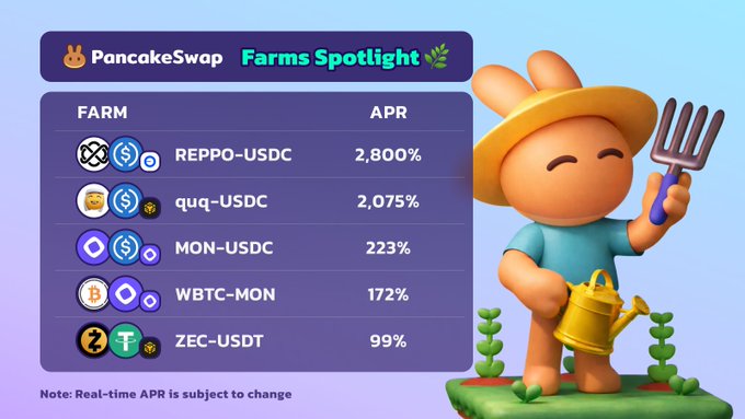 This week’s Farms Spotlight 🌾 • REPPO-USDC — pancakeswap.finance/liquidity/...… • quq-USDC — pancakeswap.finance/liquidity/...… • MON-USDC — pancakeswap.finance/liquidity/...… • WBTC-MON — pancakeswap.finance/liquidity/...… • ZEC-USDT — pancakeswap.finance/liquidity/...… Get all the latest farm updates → t.me/pcsliquiditybuffet…