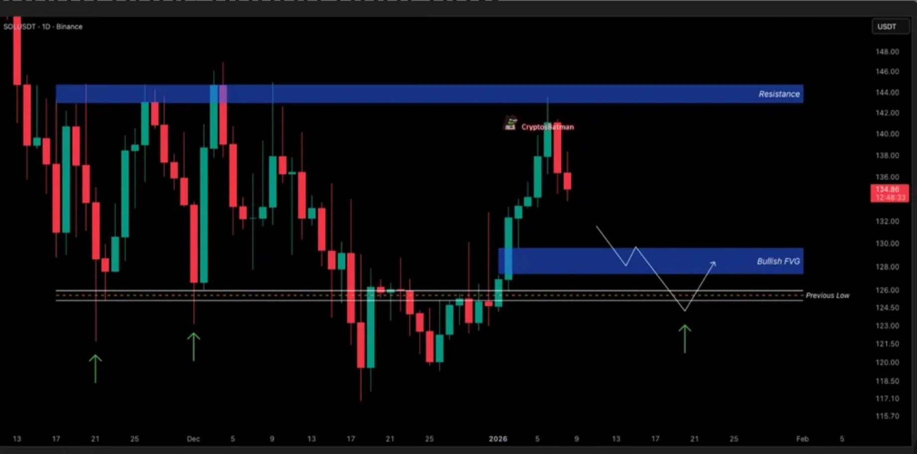 Also, the next significant support zone sits near the unfilled bullish Fair Value Gap (FVG), currently above $128, coinciding with previous lows. This area forms a potentially strong entry zone for buyers. Batman highlights that these levels, coupled with the potential formation of an inverse head and shoulders pattern, could provide a solid opportunity.