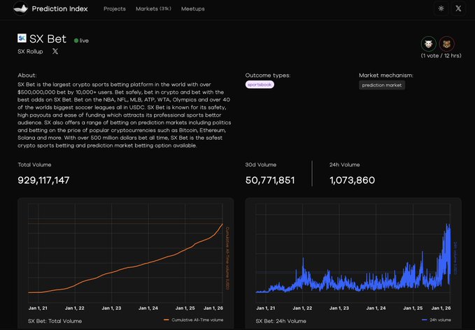 Excited to welcome @SX_Bet @SX_Network to Prediction Index 🎉 As the largest sports prediction markets in the world, with nearly $1B in indexed volume and 10,000+ users onboarded, this addition pushes the total industry volume on our site even higher. We’ve rolled out the