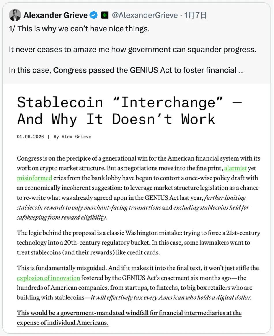 However, before the relevant committee of the U.S. Senate deliberated on the Crypto Markets Structure Act on January 15 (which aims to systematize cryptocurrency regulation), a debate had already begun on whether the ban on stablecoin interest rates should be extended to the distribution stage.