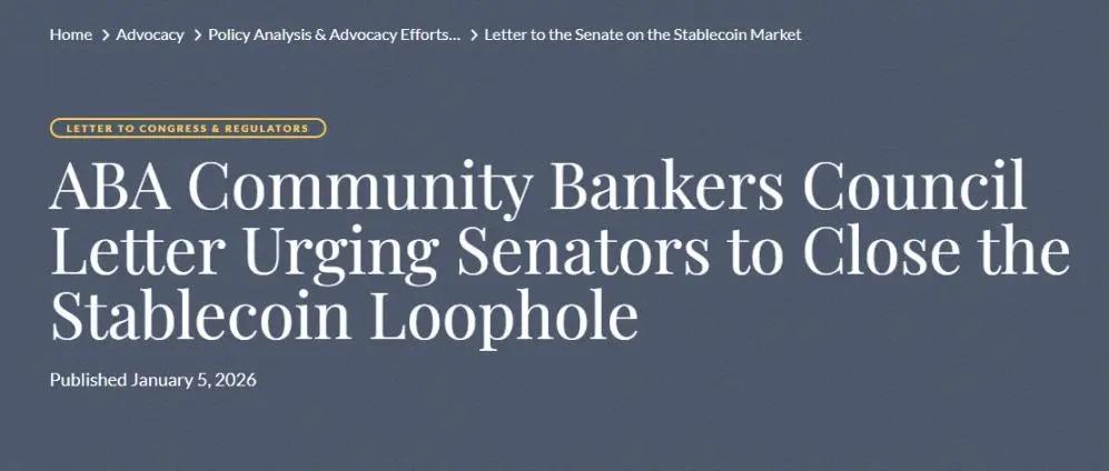 The American Bankers Association (ABA) is the leading group calling for a complete ban on interest payments on stablecoins. In an open letter released on January 5, the ABA argued that the interest payment ban under the GENIUS Act should not only apply to issuers but should be interpreted broadly to extend its scope to related parties. They are pushing to explicitly include this interpretation in the Crypto Markets Structure Act.