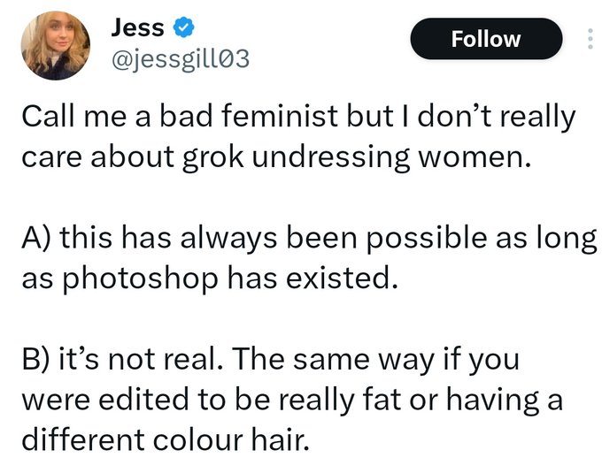 Grok has truly exposed that they don't really care about protecting women and girls. They're bending over backwards to defend the indefensible.