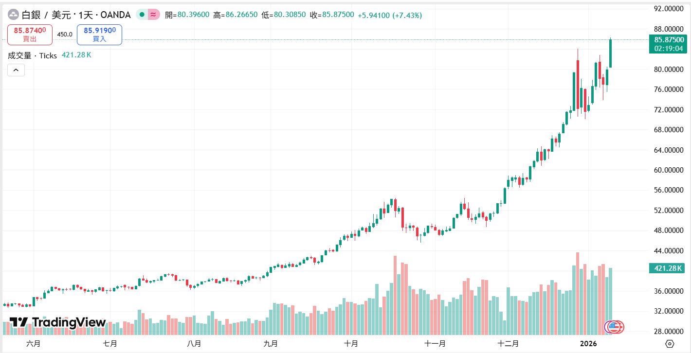 Spot silver continued its strong upward trend from 2025, climbing again in the early hours of January 13th (Taiwan time) to surpass the $85 mark, setting a new all-time high. According to the latest market data from TradingView, the spot silver price is currently at approximately $85.875 per ounce, a single-day increase of over 7%, reflecting strong investor demand for the precious metal.