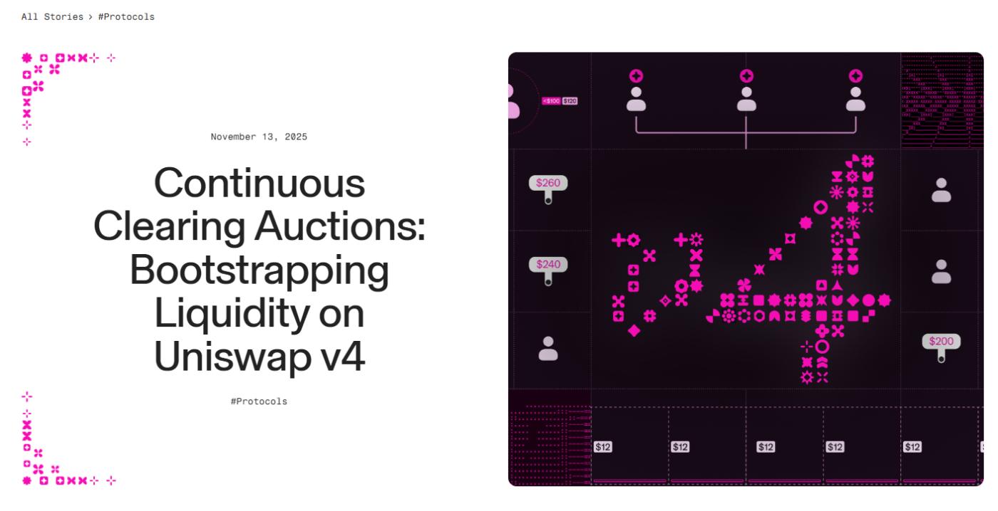 Uniswap has been rolling out Continuous Clearing Auctions (CCA) as part of its broader Liquidity Launchpad framework—an onchain mechanism designed to run fair price discovery auctions and then automatically seed a Uniswap v4 pool at the discovered clearing price.