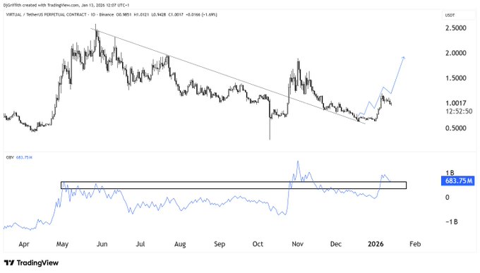 $VIRTUAL is holding very strong around the $1 level while BTC.D keeps climbing. OBV is retesting the breakout and looks solid, preparing for a move toward $2 in the short term. There is no stopping $VIRTUAL until it reaches a top 20 spot because there is no better AI project.