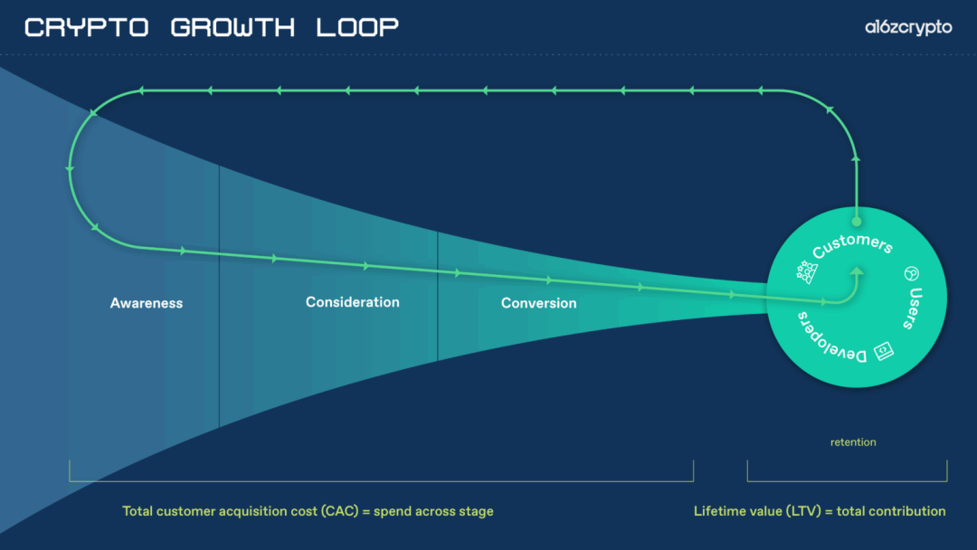 In this sense, referrals are like an inverted, bottom-up marketing funnel: users don't just stay at the conversion stage, but bring new potential users back to the top of the funnel. Early adopters become promoters, bringing more people into the network (and potentially being rewarded for their contributions), thus keeping the growth flywheel running.