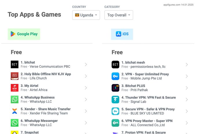 Bitchat has become the most downloaded app in Uganda amid a government-ordered nationwide internet shutdown.