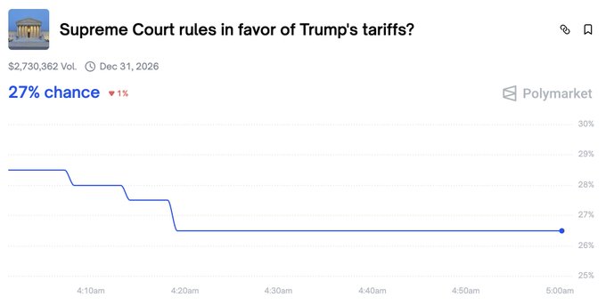 🚨 HUGE DAY TODAY 🚨 10:00am EST we're scheduled to get the US Supreme Court ruling on the Trump tariffs. Polymarket 73% says Trump tariffs will get ruled against.