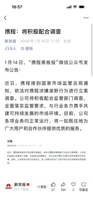 Today, the news that Ctrip is being investigated by the State Administration for Market Regulation has been interpreted by many in the crypto as being related to its overseas version supporting stablecoin payments. However, it actually has nothing to do with stablecoins. Looking at the timeline, it's clear that Ctrip acted against regulations and got caught in the crossfire. Two months ago, the Civil Aviation Administration of China (CAAC) issued several documents to crack down on low-priced airfares and combat internal competition. Many airfares are now cheaper than high-speed rail tickets, meaning neither high-speed rail nor airfares are profitable. So, the news had been circulating for some time. However, Ctrip's ability to understand the authorities' intentions was poor. Instead of restraining itself, it engaged in several low-price sales before the Spring Festival to grab traffic. Therefore, the CAAC took decisive action and explicitly launched an investigation into Ctrip for monopolistic practices.