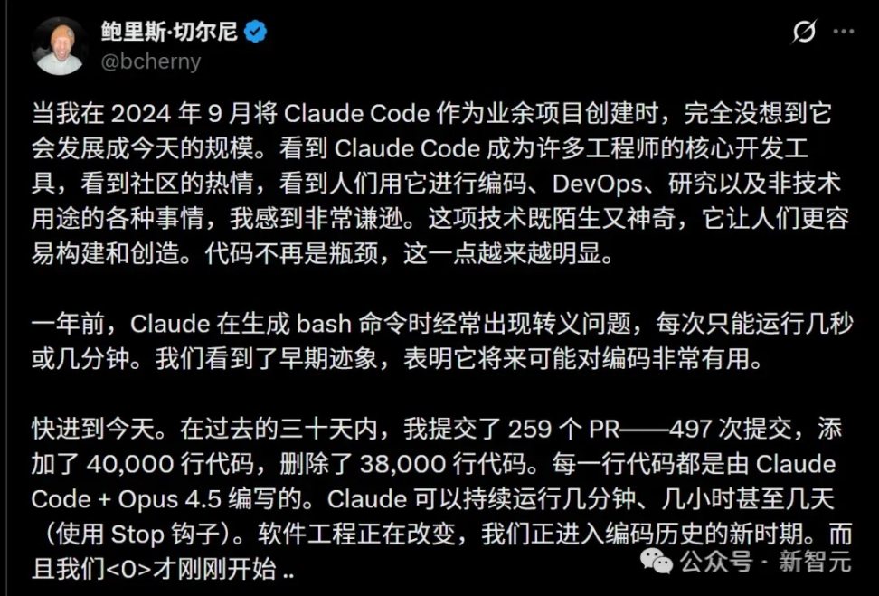 Boris recalled that in the past thirty days, he submitted 259 PRs—497 commits in total, adding 40,000 runcodes and deleting 38,000 runcodes. Each runcode was written using Claude Code + Opus 4.5.