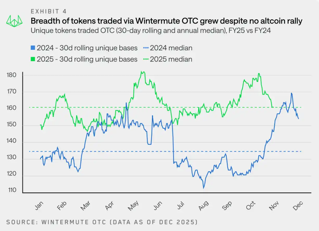 In 2025, the total number of tokens traded remained relatively stable overall. However, looking at 30-day rolling data, Wintermute traded an average of 160 different tokens, up from 133 in 2024. This indicates that OTC trading activity has expanded to a wider and more stable range of tokens.