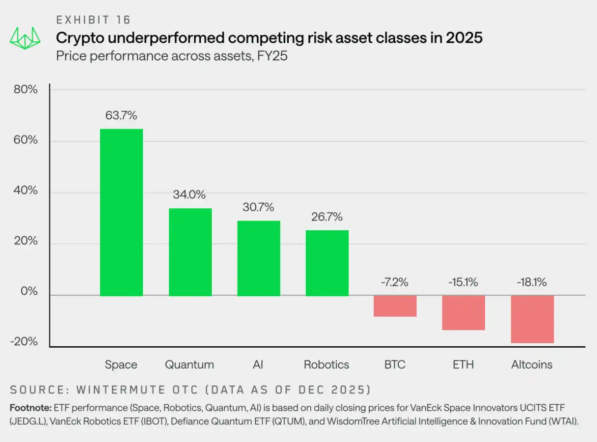 Historically, cryptocurrency native wealth has functioned as a single, fungible pool of funds, with Bitcoin's returns naturally spilling over to mainstream coins and then to Altcoin. Wintermute OTC trading data shows this spillover effect has significantly weakened. New capital instruments—especially ETFs and DATs—have evolved into "closed ecosystems." While they provide sustained demand for a few blue-chip assets, funds don't naturally rotate to the broader market. 2025 became an extremely concentrated year as retail investor interest shifted dramatically to stocks and prediction markets—a few mainstream assets absorbed the vast majority of new funds, while the rest of the market struggled to sustain growth.