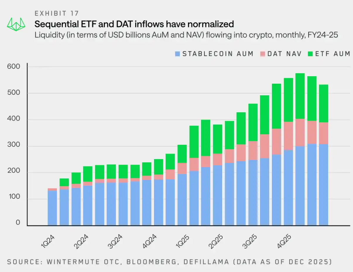 Until two years ago, stablecoins and direct investment were the primary channels for capital to enter the crypto market. However, ETFs and DAT have structurally altered the pathways through which liquidity is injected into the ecosystem.