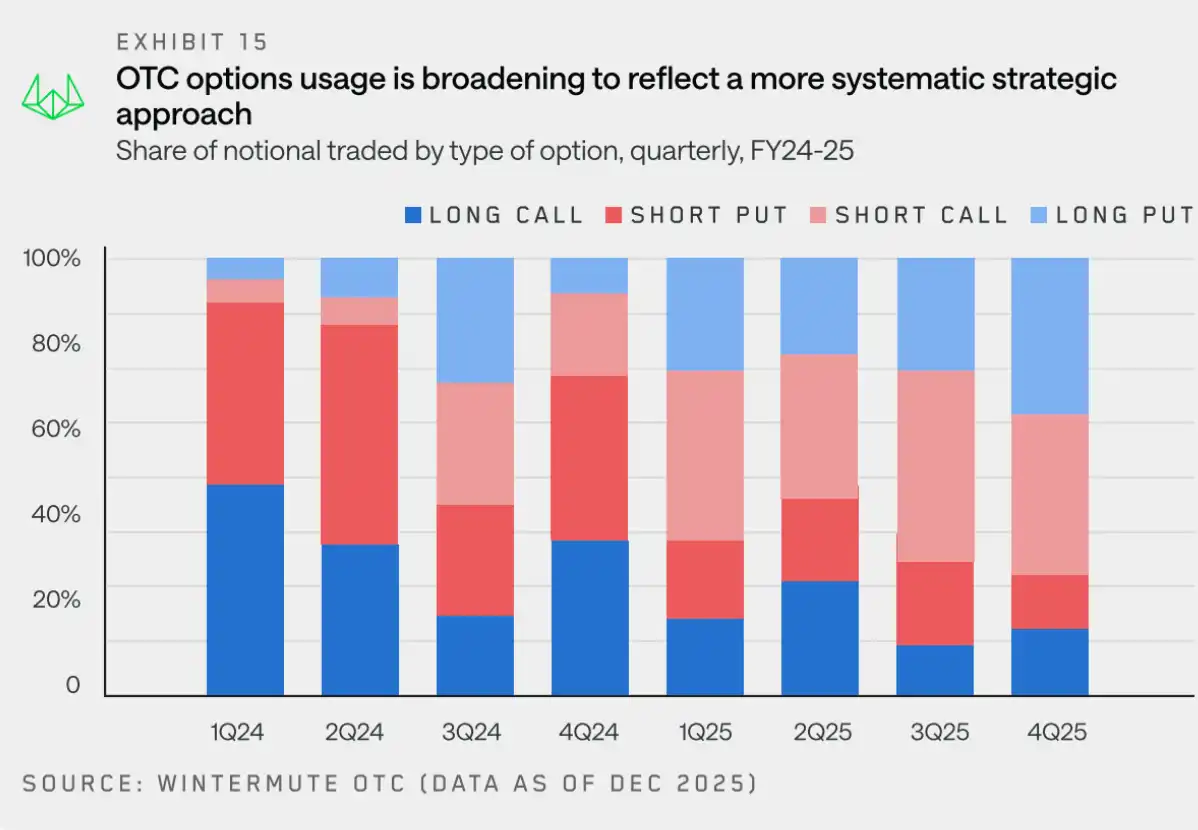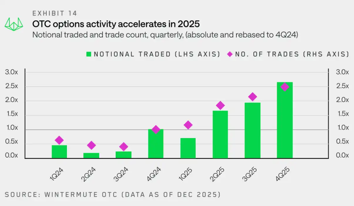 This shift has fueled a dramatic increase in options market activity: from Q4 2024 to Q4 2025, both notional trading volume and the number of trades increased by approximately 2.5 times year-over-year. This was primarily driven by more counterparties—especially crypto funds and digital asset treasuries—adopting options strategies to generate passive returns.