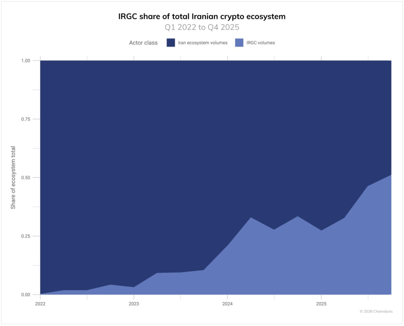 - The IRGC’s on-chain activity represents approximately 50% of Iran’s total crypto ecosystem in Q4 of 2025 and has steadily increased its share over time, mirroring its dominance in Iran’s economy more broadly.