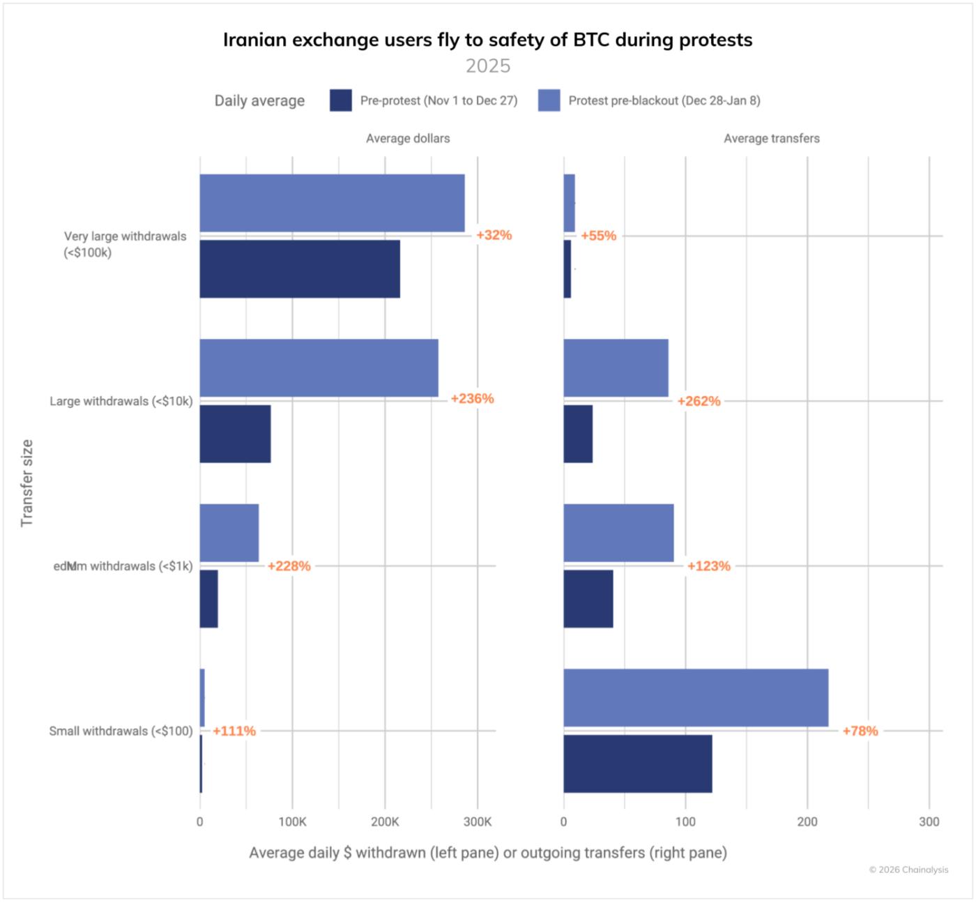 - During the recent mass protests, Iranians have significantly increased withdrawals of Bitcoin to personal wallets, possibly as a flight to safety amid currency collapse and political instability