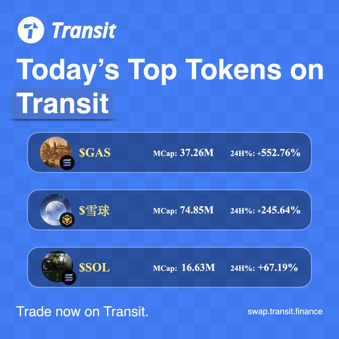 📊 Today’s Top Tokens on Transit $GAS +552% $雪球 +245% @AnnotLorra24580 $SOL +67% The market is moving fast — don’t blink. Trade instantly on @TransitFinance ⚡ 🔁 http:/swap.transit.finance