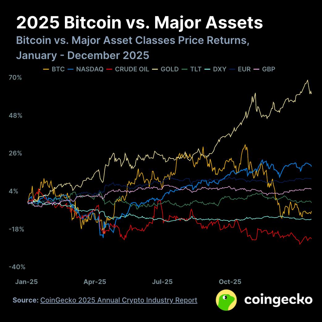 - Gold performed exceptionally well in 2025, surging 62.6%, while Bitcoin lagged behind, falling 6.4%, and the US dollar and oil also underperformed.