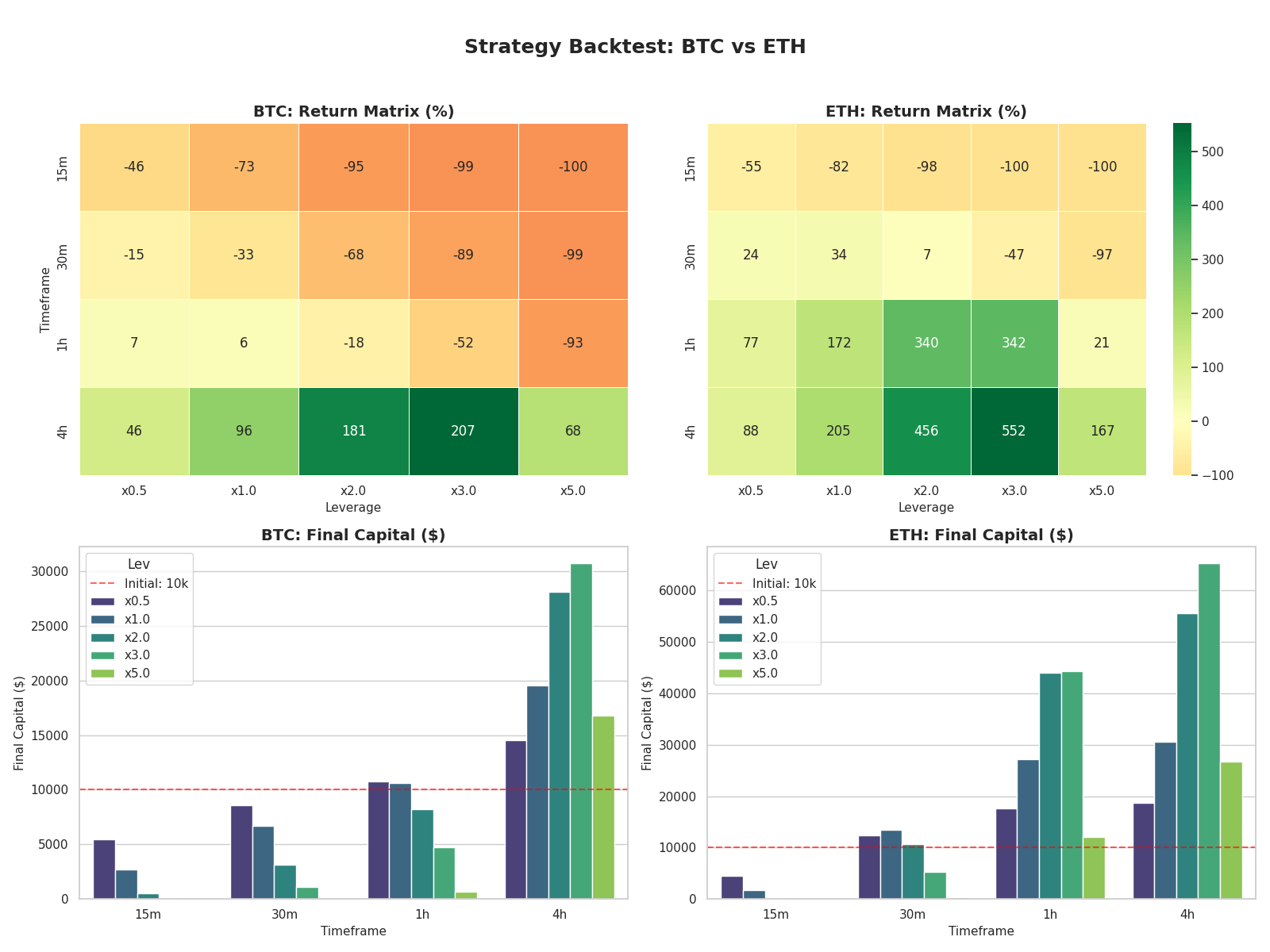 - ETH 4h x3.0 (+552%) vs ETH holding (+53.00%): Returns magnified 10 times! This is the pinnacle of quantitative trading performance—achieving leapfrog returns on highly volatile assets with reasonable leverage and the right timeframe.
