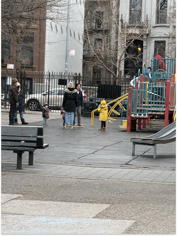 If we were going to sell to kids (via their parents), we would need to go to the playground, which we did this morning in a light 8:30am snow. We brought all five Donut Hats in a bag, and laid them out on a built-in table/chess board. There were only two other parent-kid combos there, and neither looked particularly in the mood to spend, so Dev half-heartedly and Maya full-throatedly yelled, “Get your Donut Hats! Ten BUCKS!” No one heard. It’s a big playground.