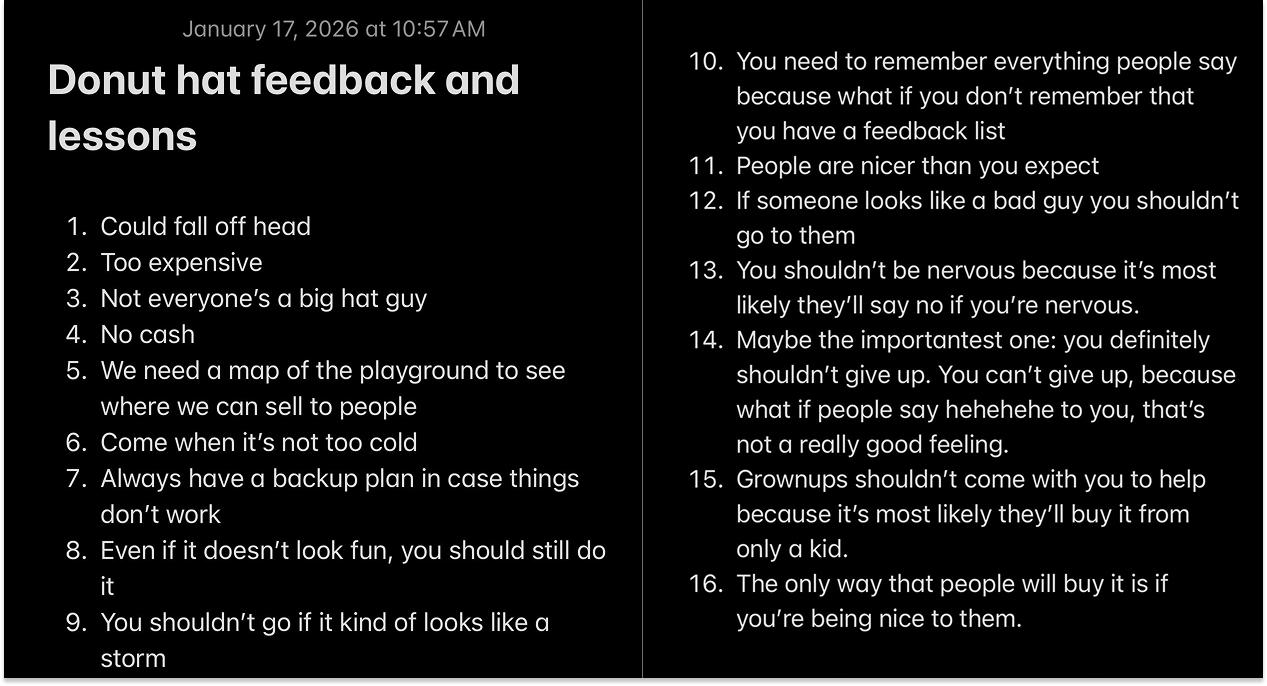 HUGE. That was the first of what will be many, many No’s in Dev’s life, and he handled it gracefully. I told him it was awesome. We’d gotten our first customer feedback. I pulled out Apple Notes, titled it “Donut Hat feedback,” and told him we should write down all of the feedback we get so that we could go home and improve the product.
