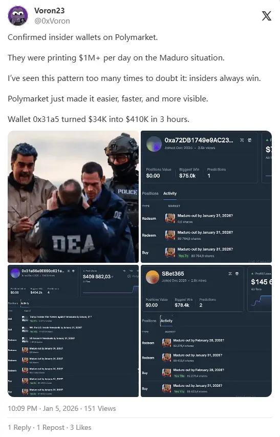 However, hours later, police arrested Maduro and brought him to criminal charges in New York. The account had closed out positions with a profit exceeding $400,000. The market was right. And that's the problem.