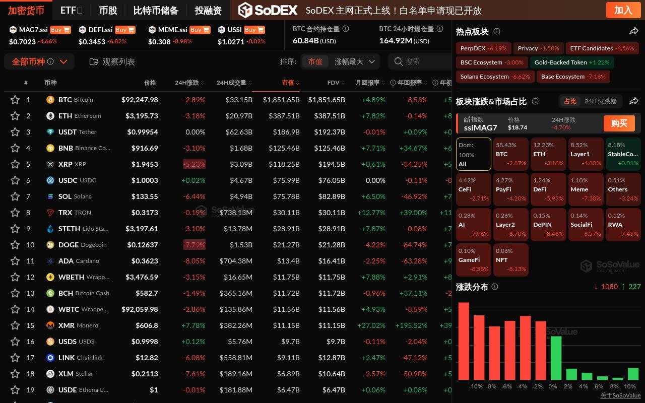 In other sectors, the CeFi sector fell 2.71% in the last 24 hours, with Aster (ASTER) down 9.94%; the PayFi sector fell 4.20%, but Dash (Dash) bucked the trend and rose 10.32%; the Layer 1 sector fell 4.80%, with Sui (SUI) down 11.04%; the DeFi sector fell 5.97%, with Frax (FRAX) up 31.97%; the Layer 2 sector fell 6.70%, with River (RIVER), which had previously seen consecutive large gains, rising again by 26.40%; and the Meme sector fell 7.30%, with MemeCore (M) up 1.78%.