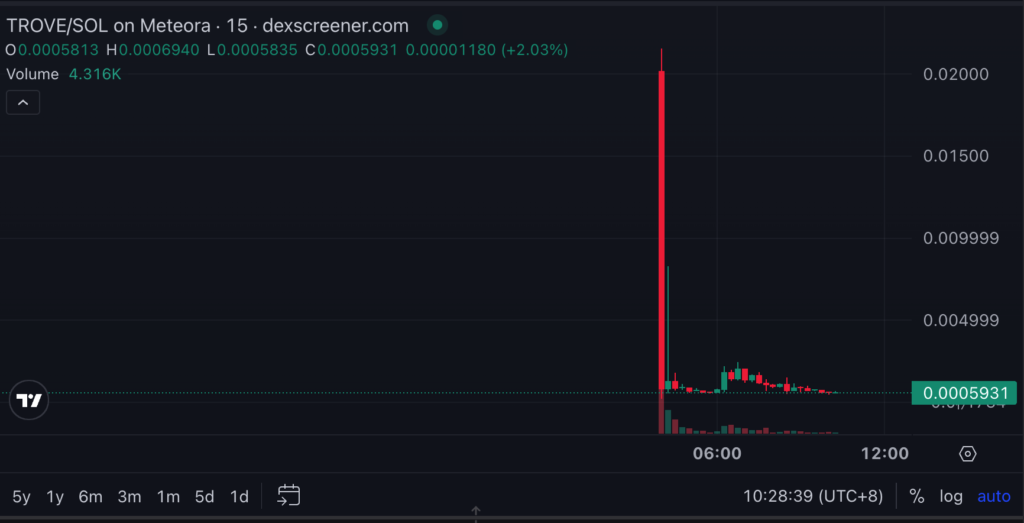 The market performance of the TROVE token was further exacerbated. According to DEXScreener data, the token plummeted 95% from its opening price to a low of $0.0008 within just 10 minutes of its launch. Its market capitalization also dropped from approximately $20 million to less than $1 million, practically reaching zero.