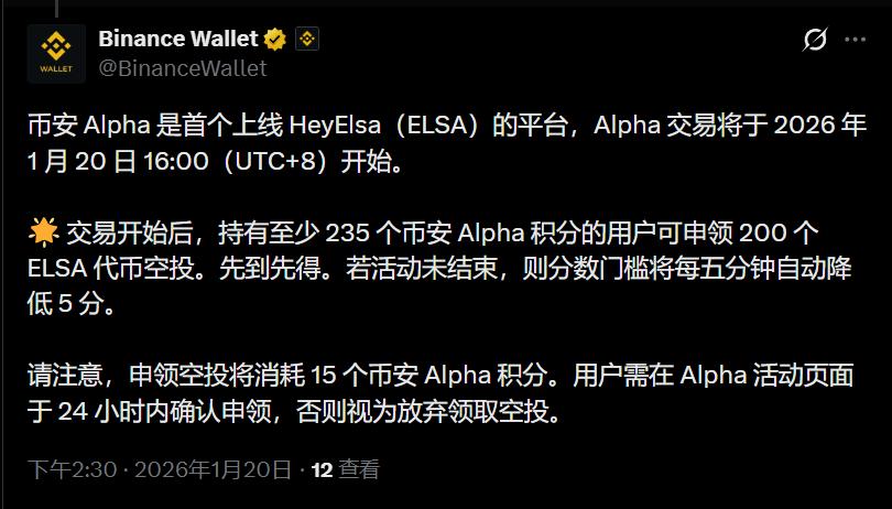According to a report by TechFlow on January 20, Binance Alpha is the first platform to list HeyElsa (ELSA). Alpha trading will begin at 16:00 (UTC+8) on January 20, 2026.